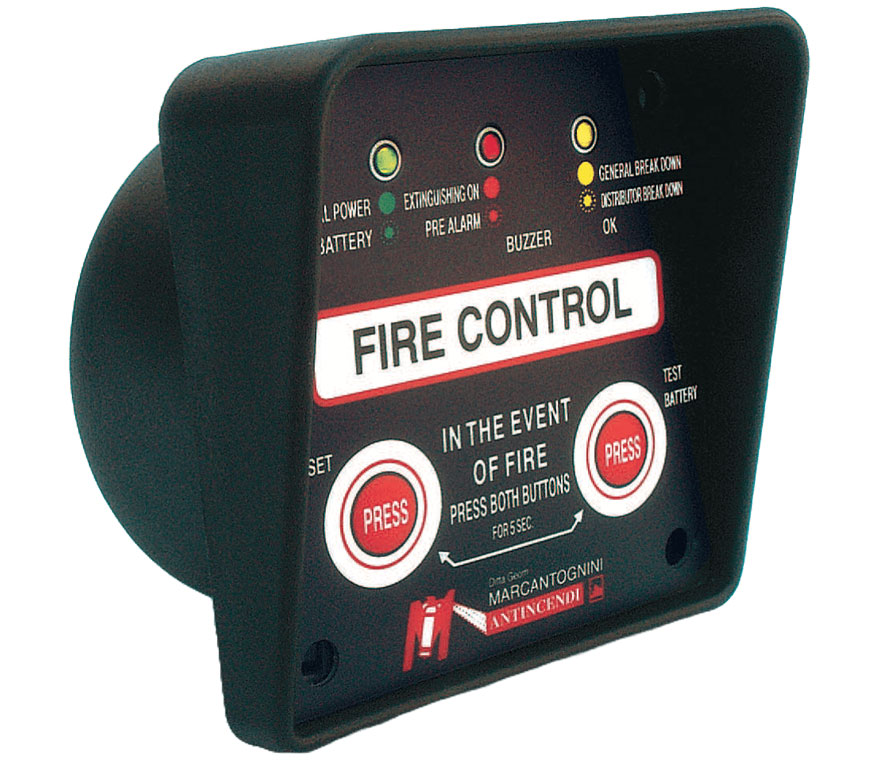 Unità centrale di comando e controllo autoalimentata che permette di controllare lo stato del sistema attraverso indicatori LED e di attivare il generatore Firecom. Mare15 funziona elettricamente in modo manuale con una scarica ritardata 5 sec. o automaticamente attraverso un cavo termosensibile.