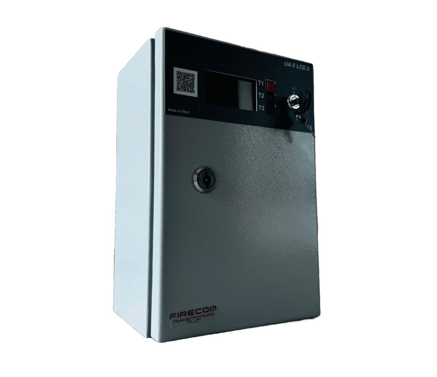 L’unità UA-5 LCD.2 funge da interfaccia tra la centrale di rilevazione e i generatori ad aerosol Firecom. Essa gestisce fino a 5 linee composte da un massimo di 10 generatori ciascuna e ha la possibilità di fare 2 scariche separate (20+30 generatori).